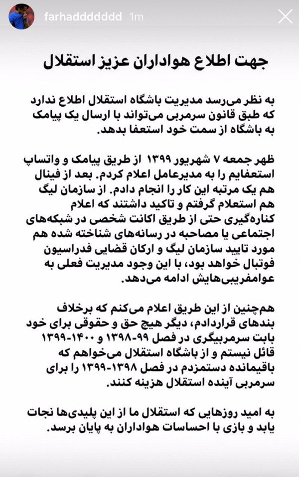ظهر جمعه ۷ شهریور ۱۳۹۹ از طریق پیامک و واتساپ استعفایم را به مدیرعامل اعلام کردم. بعد از فینال هم یک مرتبه این کار را انجام دادم. از سازمان لیگ هم استعلام گرفتم و تاکید داشتند که اعلام کنارهگیری حتی از طریق اکانت شخصی در شبکههای اجتماعی یا مصاحبه در رسانههای شناخته شده هم مورد تایید سازمان لیگ و ارکان قضایی فدراسیون فوتبال خواهد بود، با این وجود مدیریت فعلی به عوامفریبیهایش ادامه میدهد.
