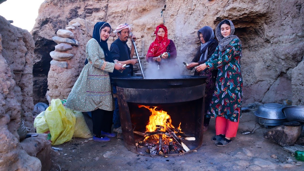 ببینید؛ غذای روستایی در افغانستان؛ پخت قابلی پلو با گوشت توسط یک خانواده افغان