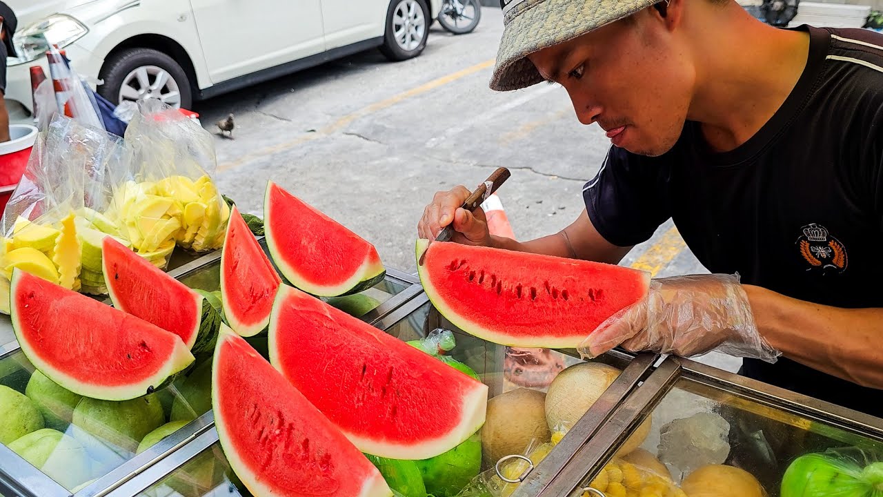 در این ویدئو یک فروشنده ماهر ساکن یکی از خیابان های بانکوک تایلند را خواهید دید که با سرعت و مهارت هندوانه و آناناس را برش می زند.