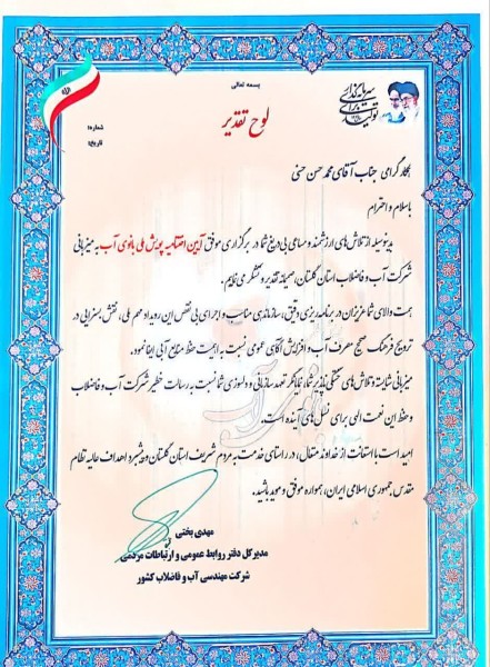 بدین وسیله از تلاش‌های ارزشمند و مساعی بی دریغ شما در برگزاری موفق آیین اختتامیه پویش ملی بانوی آب به میزبان شرکت آب و فاضلاب استان گلستان صمیمانه تقدیر و تشکر می‌نمایم.