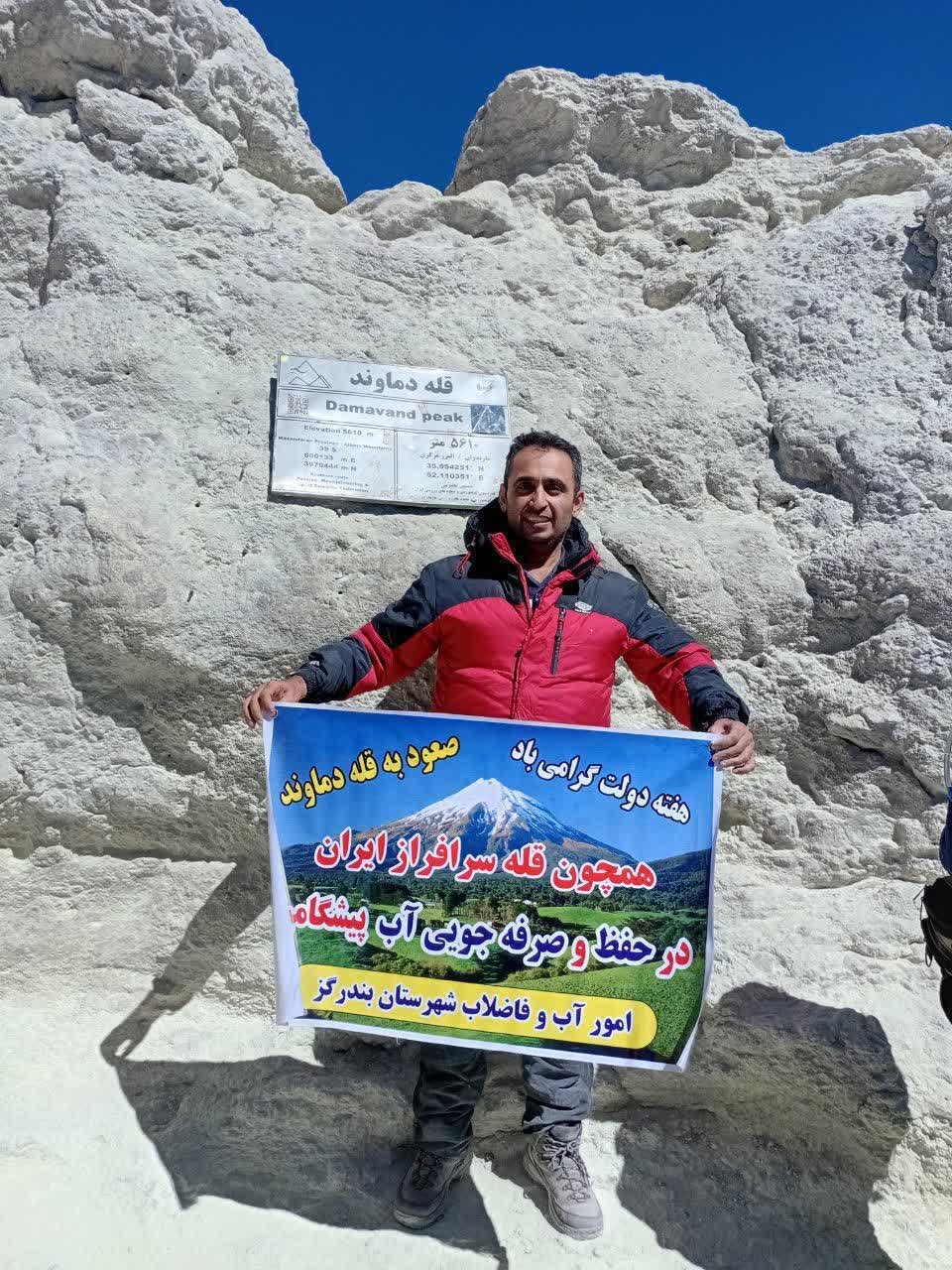«دامغانی جزی»، با حمل پرچمی حاوی این شعار، در ارتفاع ۵۶۱۰ متری بام ایران، اهمیت حفاظت از منابع آبی را به نمادی ملی گره زد.