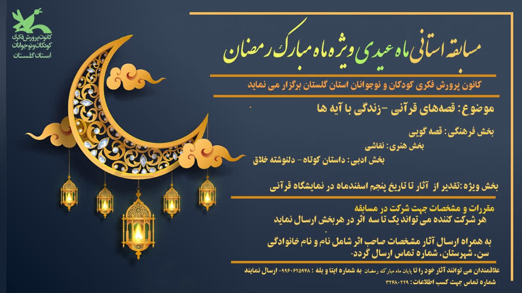 همزمان با فرارسیدن ماه مبارک رمضان، کانون پرورش فکری استان گلستان با هدف ترویج فرهنگ قرآنی و تقویت مهارت‌های فرهنگی، ادبی و هنری، مسابقه استانی «ماه عیدی» را ویژه کودکان و نوجوانان برگزار می‌کند.