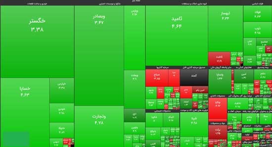 معامله گران امروز یک میلیون معامله به ارزش ۶۹ هزار و ۶۷۱ میلیارد ریال انجام دادند. در این بازار فولاد مبارکه اصفهان، ملی صنایع مس ایران، صنایع پتروشیمی خلیج فارس، معدنی و صنعتی گل گوهر، س. نفت و گاز و پتروشیمی تامین، پارایش نفت اصفهان و سرمایه گذاری غدیر نسبت به سایر نمادها بیشترین تاثیر مثبت را گذاشتند و پالایش نفت اصفهان، ایران خودرو، بانک ملت، فولاد مبارکه اصفهان، گروه پتروشیمی س.ایرانیان، ملی صنایع مس ایران و بانک صادرات نمادهای پر بیننده این بازار بودند.