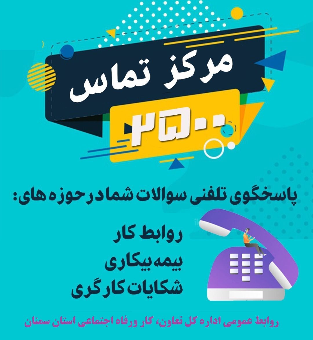 وی افزود: متقاضیان ارجمند می توانند برای مشاوره رایگان و دریافت پاسخ سوالات خود، در حوزه‌های مختلف روابط کار منجمله مراجع حل اختلاف، بیمه بیکاری، بازرسی کار، شکایات کارگری، طبقه بندی مشاغل، تشکل های کارگری و کارفرمایی، مشاغل سخت و زیان آور و ... در تهران بدون کد و در کلیه شهرستان ها با شماره گیری 2500-021 با این مرکز ارتباط برقرار نمایند.