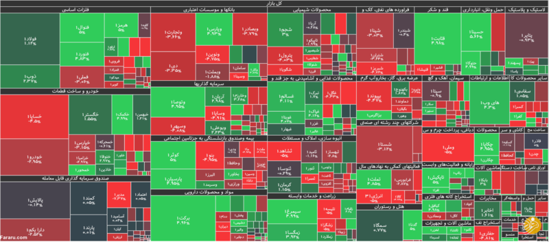 جزئیات شاخص و معاملات بورس امروز یکشنبه ۲۳ آذرماه ۹۹نقشه بازار در ابتدای معاملات روز یکشنبه ۲۳ آذرماه (برای مشاهده در ابعاد بزرگتر، روی عکس کلیک کنید)