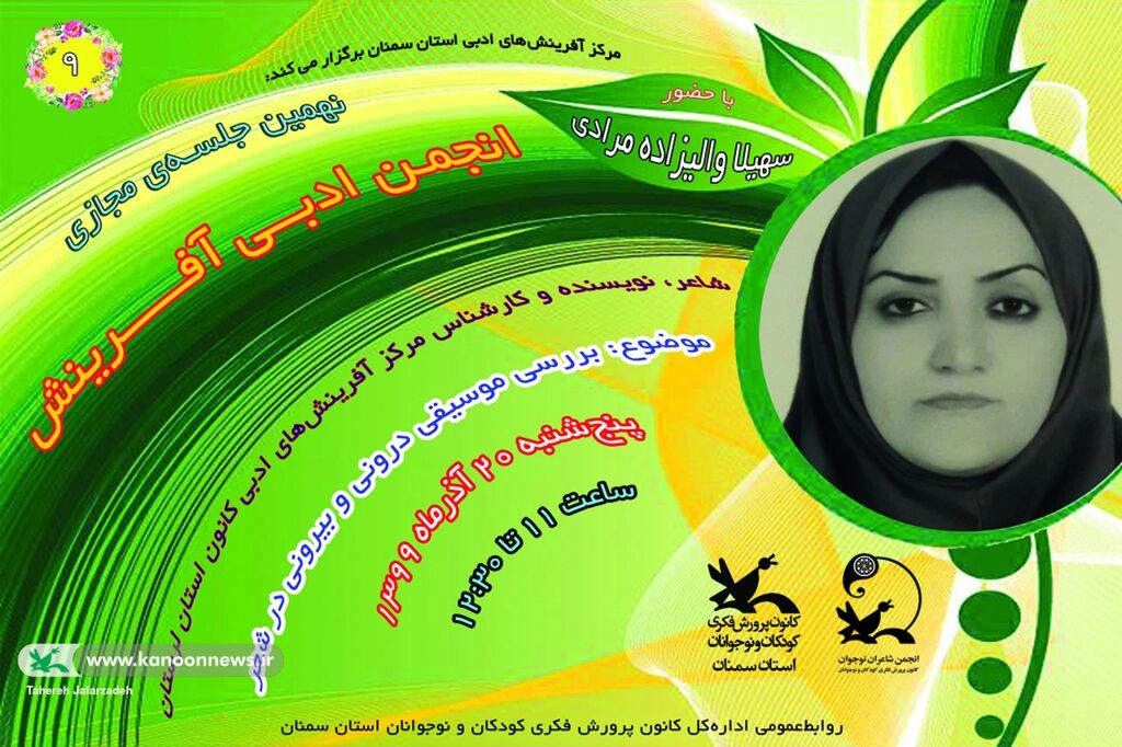 به گزارش روابطعمومی ادارهکل کانون استان سمنان، نهمینجلسهی مجازی انجمن شاعران نوجوان کانون پرورش فکری کودکان و نوجوانان سمنان، پنجشنبه ۲۰ آذر ۱۳۹۹ با دعوت از سهیلا والیزادهمرادی شاعر، منتقد و کارشناس مرکز آفرینشهای ادبی کانون استان لرستان در پیامرسان واتساپ، برگزار و ضمن نقد و بررسی آثار اعضای این انجمن، پیرامون موضوع «موسیقی بیرونی و درونی در شعر» گفتوگو شد.