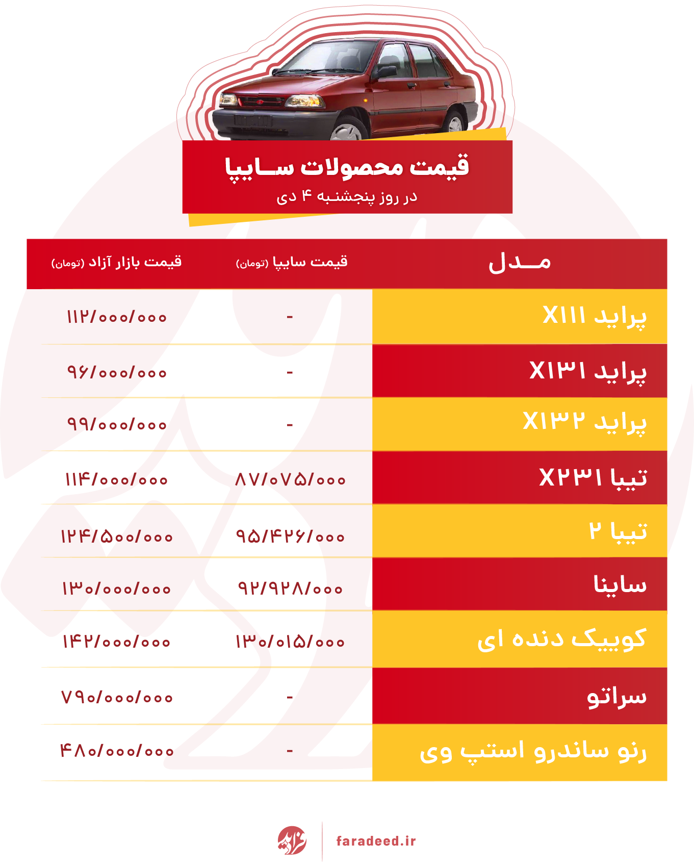 کد: 57516 | 04 دی 1399 ساعت 11:33 قیمت خودروهای سایپا امروز پنجشنبه ۴ دی ۹۹ جدول قیمت خودروهای سایپا امروز پنجشنبه ۴ دی ۹۹ را مشاهده کنید. قیمت خودرو اشتراک گذاری گزارش خطا × اشتراک گذاری مطلب: قیمت خودروهای سایپا امروز پنجشنبه ۴ دی ۹۹ فیسبوک اینستاگرام تلگرام ایکس (توییتر) ایتا بله روبیکا × گزارش خطا برای گزارش خطا با پست الکترونیکی: ruydadiran[at]gmail.com در ارتباط باشید