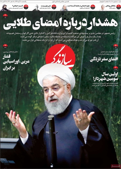 هشدار روحانی درباره امضای طلایی ؛ تیتر یک روزنامه سازندگی یکشنبه 6 آبان 97