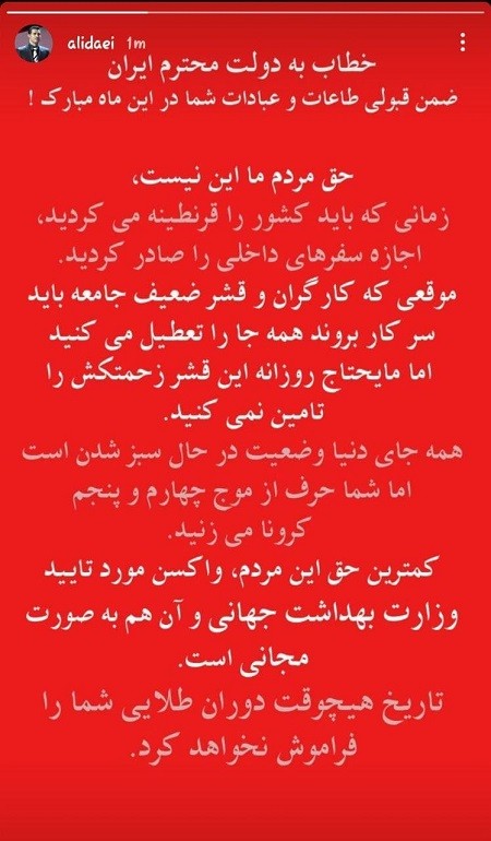کد: 68977 | 02 اردیبهشت 1400 ساعت 08:00 استوری اعتراضی علی دایی نسبت به عملکرد دولت علی دایی، آقای گل فوتبال جهان در انتقاد از عملکرد مسئولان در حوزه بهداشت استوری تندی را منتشر کرد. علی دایی اشتراک گذاری گزارش خطا × اشتراک گذاری مطلب: استوری اعتراضی علی دایی نسبت به عملکرد دولت فیسبوک اینستاگرام تلگرام ایکس (توییتر) ایتا بله روبیکا × گزارش خطا برای گزارش خطا با پست الکترونیکی: ruydadiran[at]gmail.com در ارتباط باشید