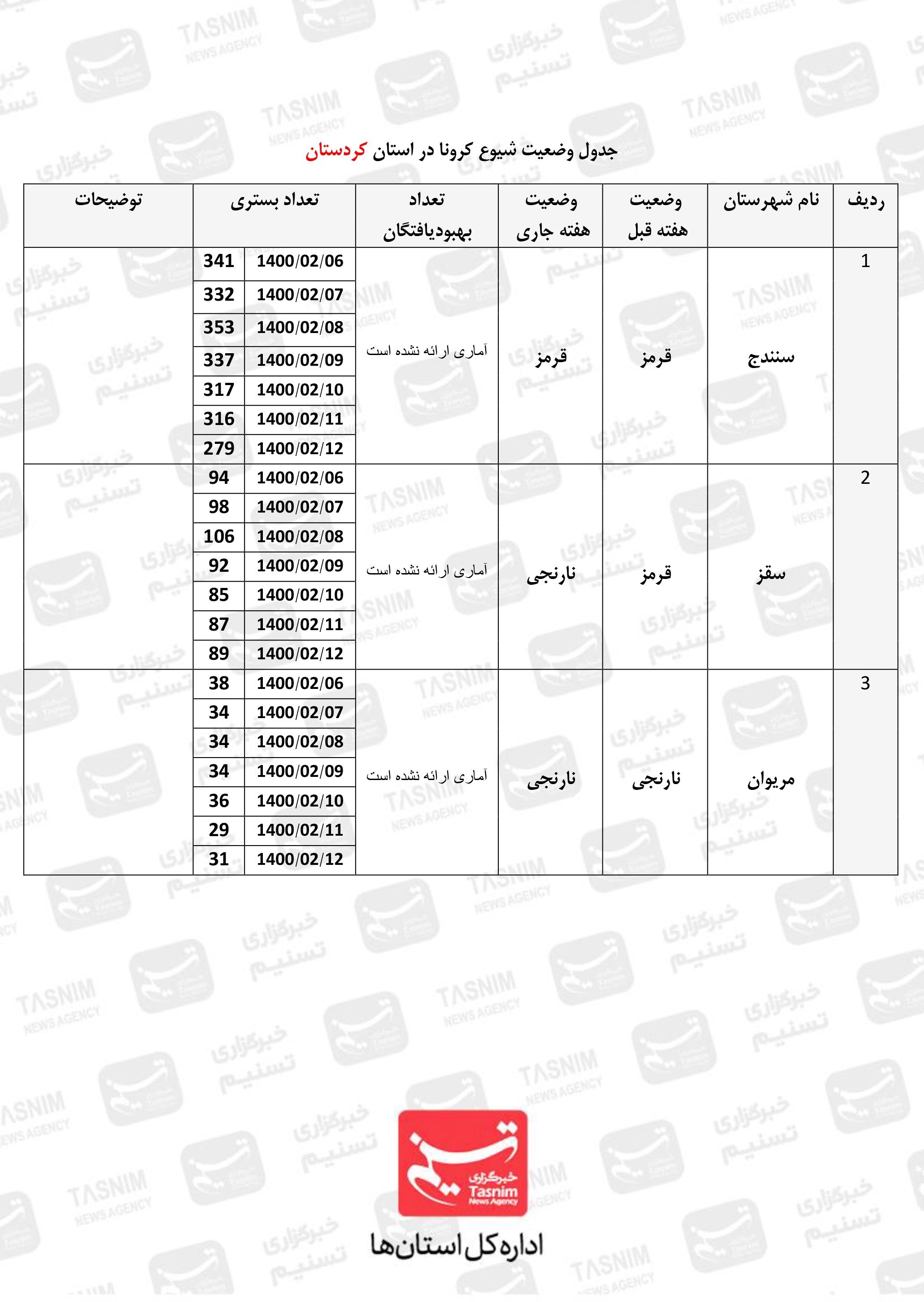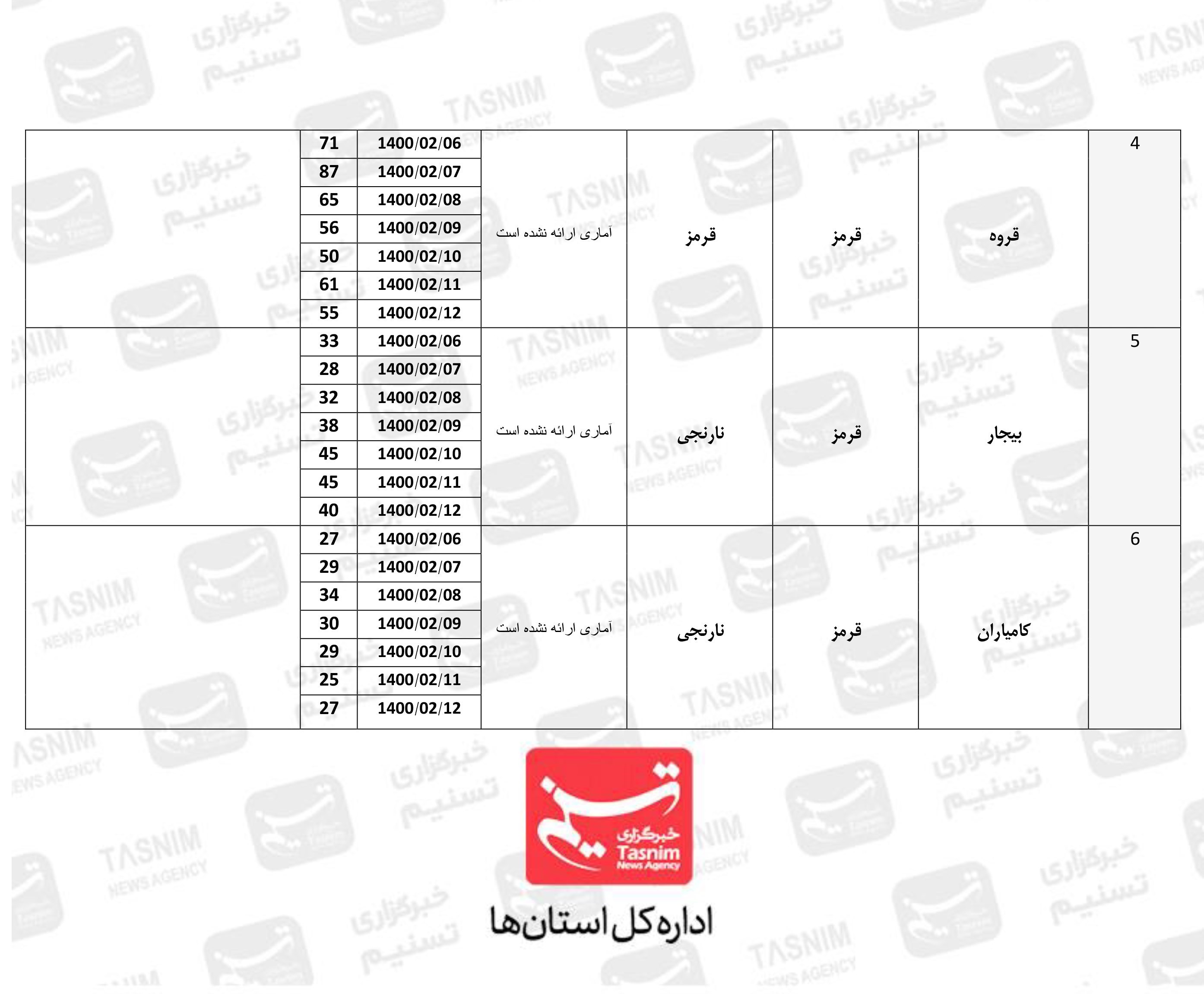 براساس آخرین رنگبندی؛ در حال حاضر شهرستانهای "سنندج، قروه، بانه و دیواندره" در وضعیت قرمز کرونایی؛ بیجار، سقز، مریوان و کامیاران نارنجی و دهگلان و سروآباد نیز در وضعیت زرد قرار دارند که در مقایسه با هفته گذشته شهرستانهای سقز، بیجار و کامیاران از وضعیت قرمز به نارنجی و دهگلان نیز از نارنجی به زرد تغییر رنگ داده است.