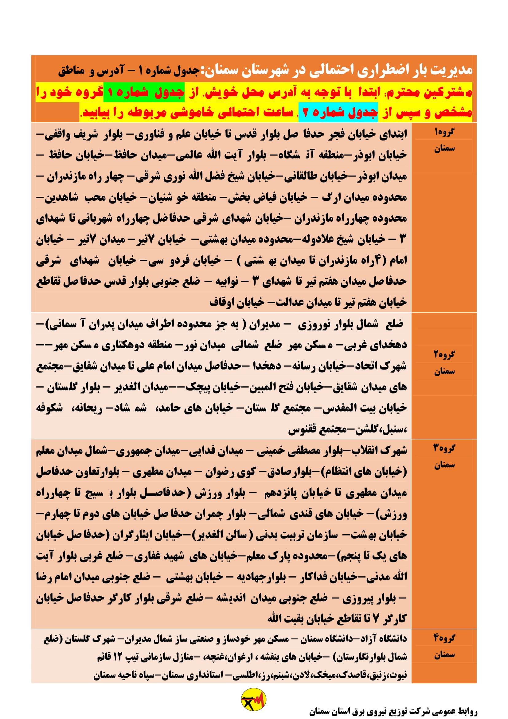 برنامه قطعی برق سمنان یکشنبه 6تیر ۱۴۰۰