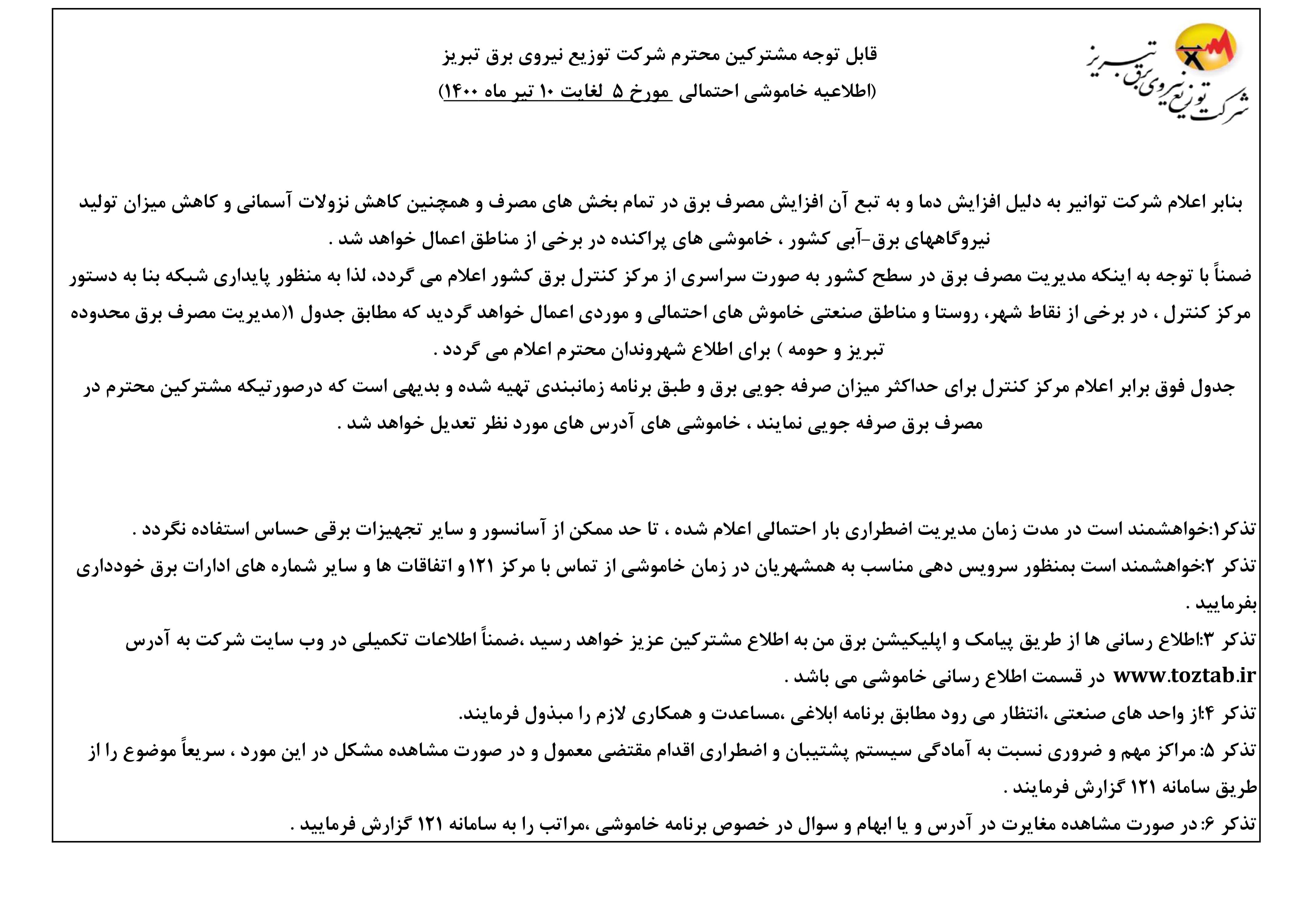 برنامه قطعی برق تبریز دوشنبه 7 تیر ۱۴۰۰