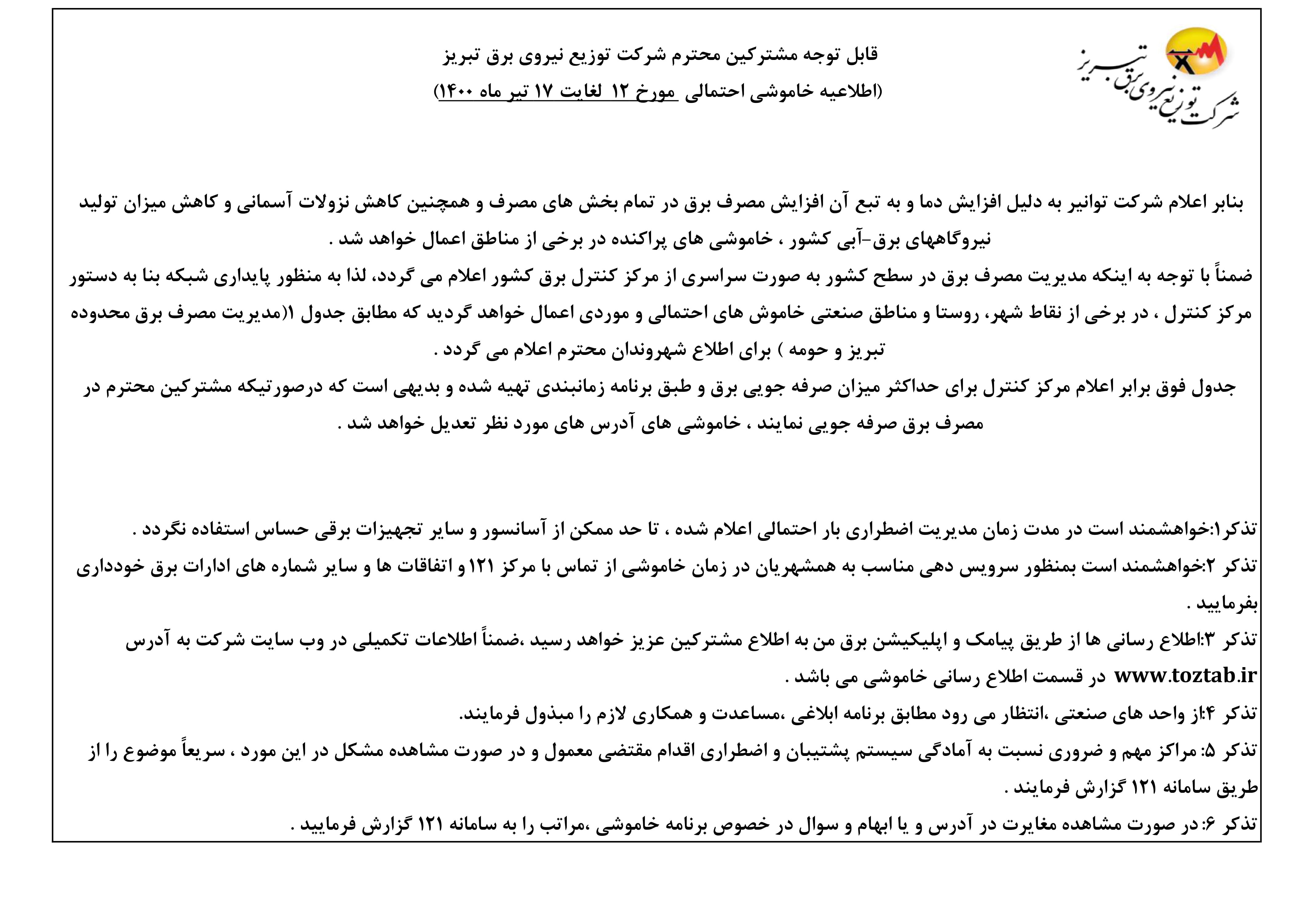 کد: 78276 | 10 تیر 1400 ساعت 12:02 برنامه قطعی برق تبریز شنبه 12 تیر ۱۴۰۰ برنامه قطعی برق تبریز شنبه 12 تیر ۱۴۰۰ برای اطلاع از آخرین برنامه قطعی برق در کشور کلیک کنید اشتراک گذاری گزارش خطا × اشتراک گذاری مطلب: برنامه قطعی برق تبریز شنبه 12 تیر ۱۴۰۰ فیسبوک اینستاگرام تلگرام ایکس (توییتر) ایتا بله روبیکا × گزارش خطا برای گزارش خطا با پست الکترونیکی: ruydadiran[at]gmail.com در ارتباط باشید