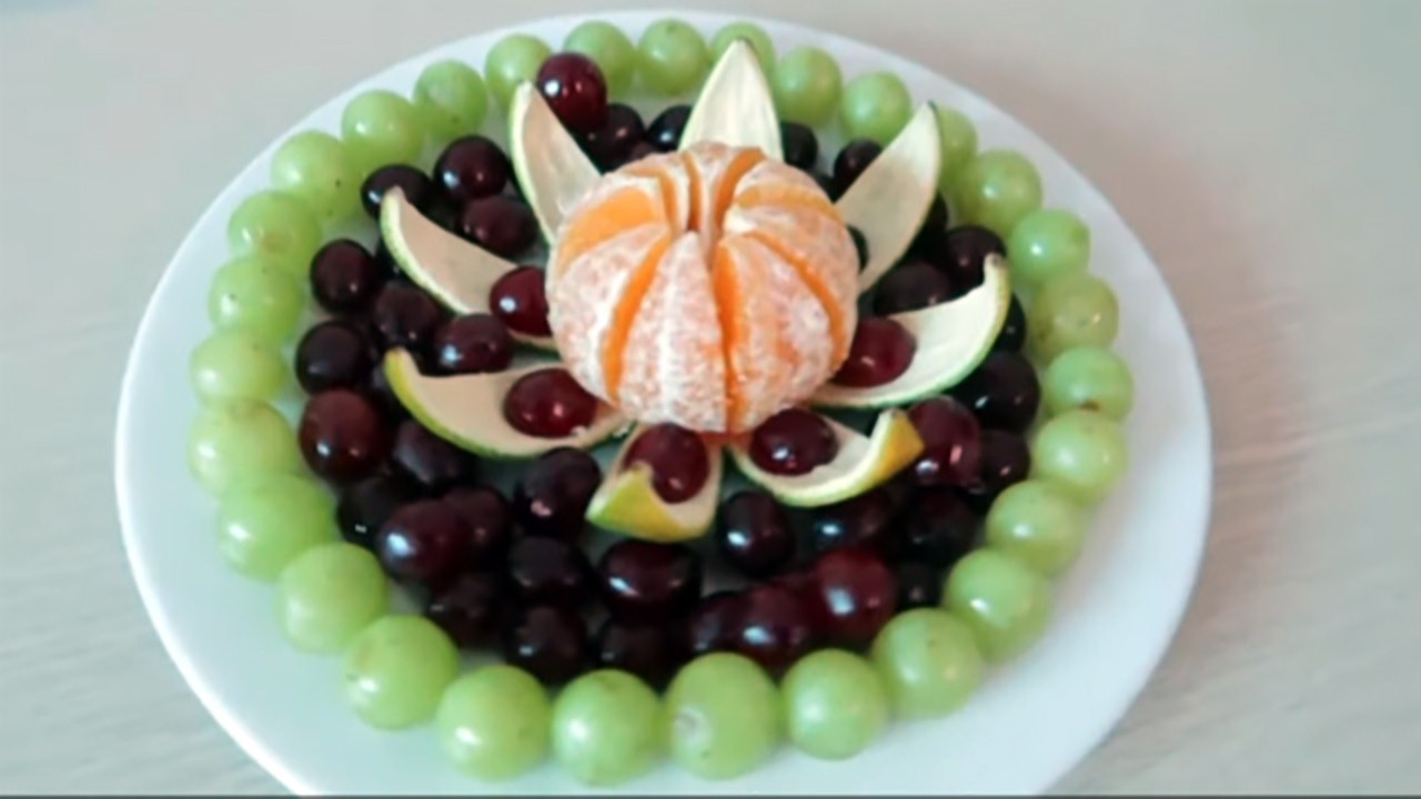 در ویدئوی زیر برای تزیین بشقاب دسر از دو میوه انگور و پرتقال استفاده شده است. شما با انجام چند برش ساده و کمی حوصله میتوانید این کار را در منزل انجام دهید.