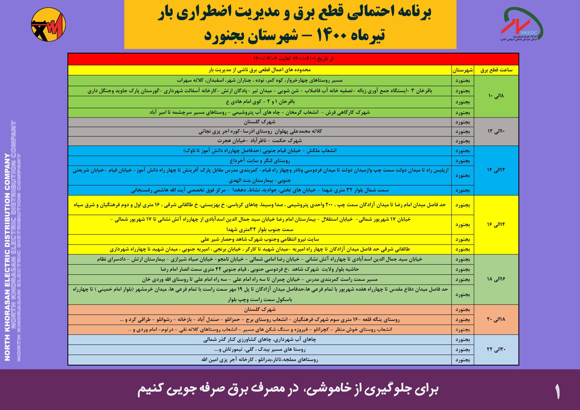 برنامه قطعی برق خراسان شمالی یکشنبه 20 تیر ۱۴۰۰