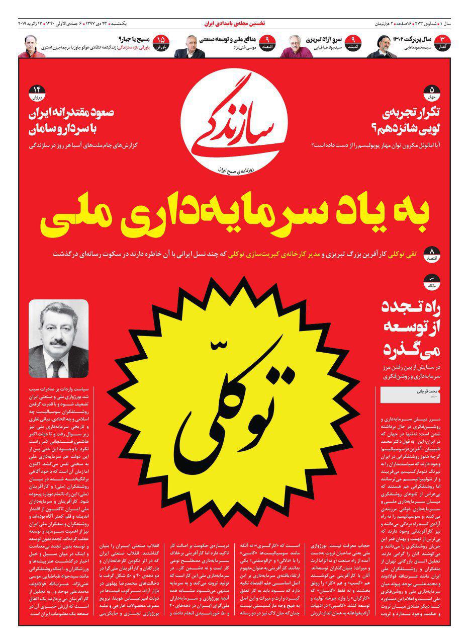 روزنامه سازندگی به یاد سرمایهداری ملی را روی جلد برد
