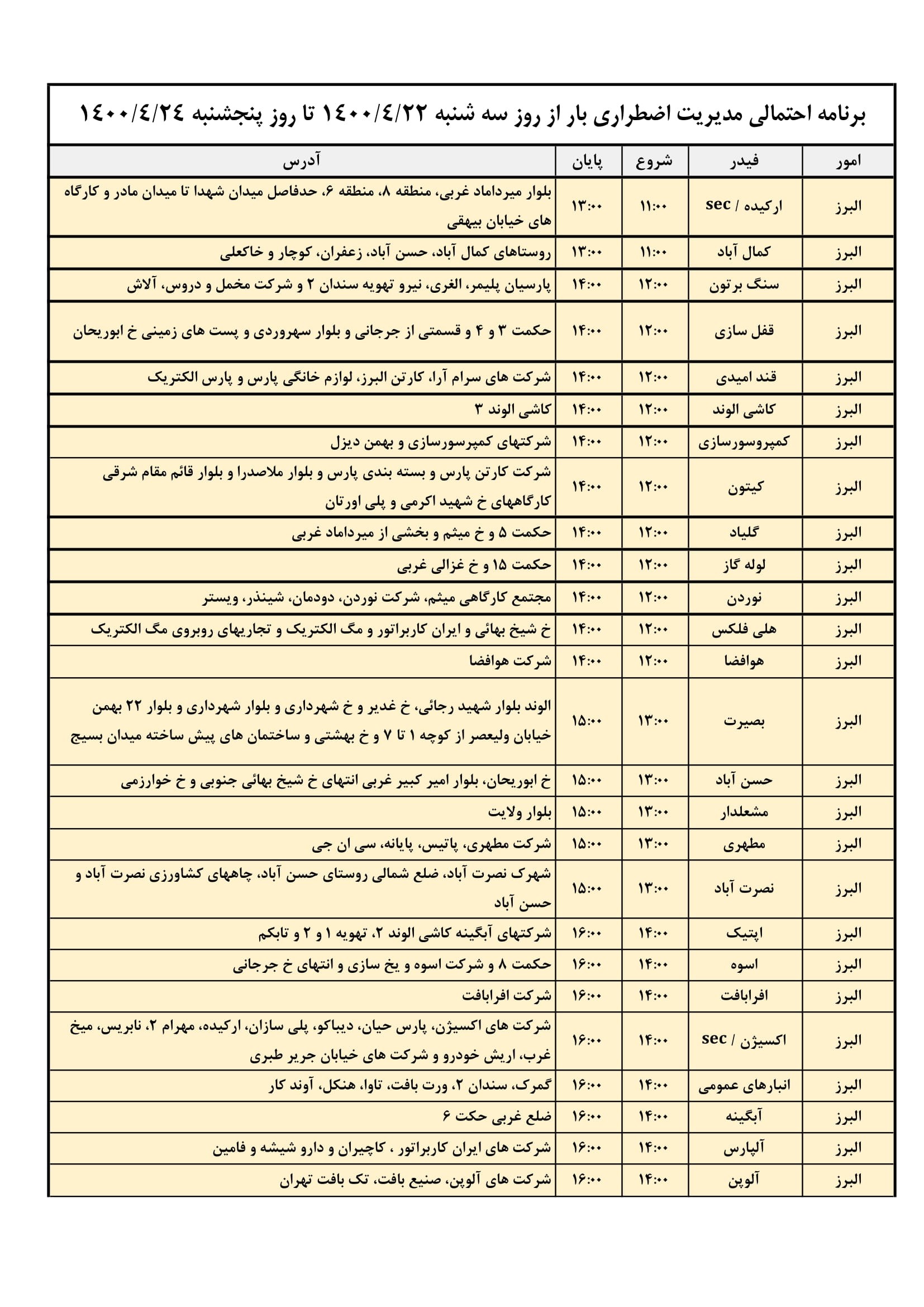 برنامه قطعی برق قزوین پنجشنبه 24 تیر ۱۴۰۰