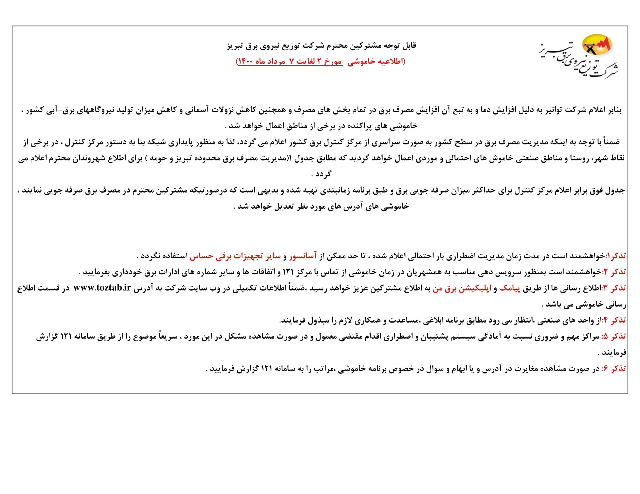 برنامه قطعی برق تبریز چهارشنبه 6 مرداد ۱۴۰۰