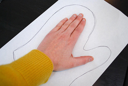 ابتدا دست خود را روی تکه ای کاغذ قرار بدهید به صورتی که 4 انگشت شما به هم بچسبند حدود 3 سانتیمتر بزرگتر از دست خط بکشید. سپس آن را برش بزنید.