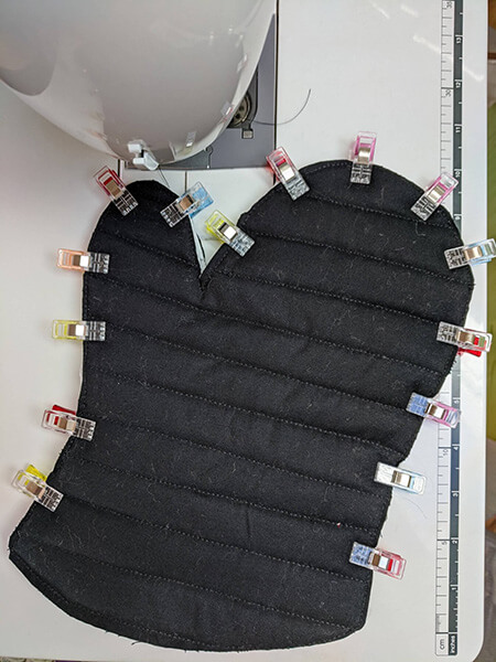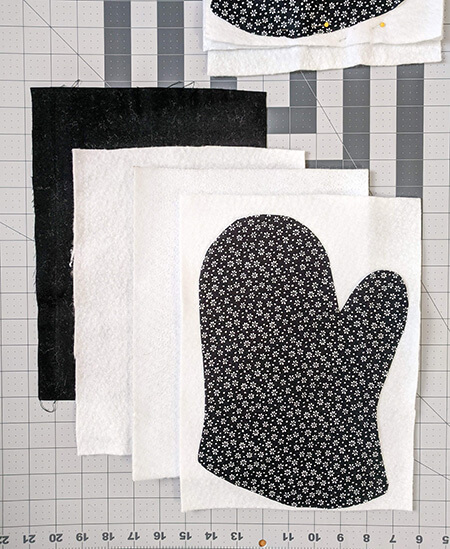 پس از برش پارچه ی آستر را روی سطحی صاف قرار بدهید، سپس پارچه ی عایق را روی آن بگذارید و پس از آن پارچه ی طرح دار را روی پارچه ی عایق قرار بدهید. و آن را با گیره هایی و یا سوزن ثابت کنید. بدون اینکه تکان بخورد با چرخ روی آن ها را دوخت هایی بروید. تا ?ایه دستکش هر کدام 3 لایه داشته باشید.