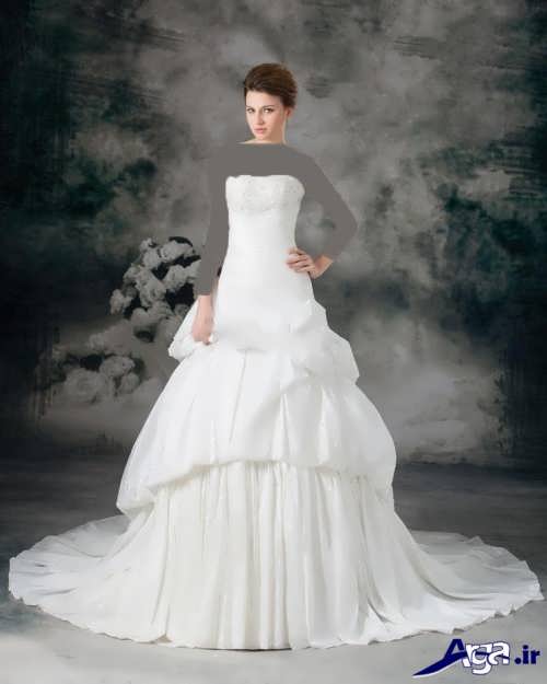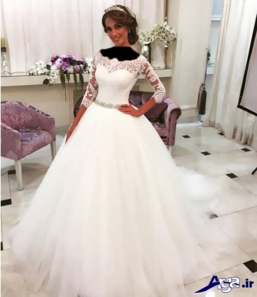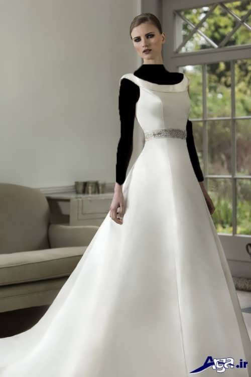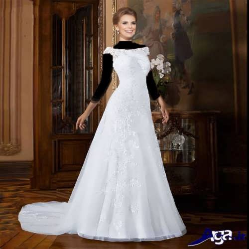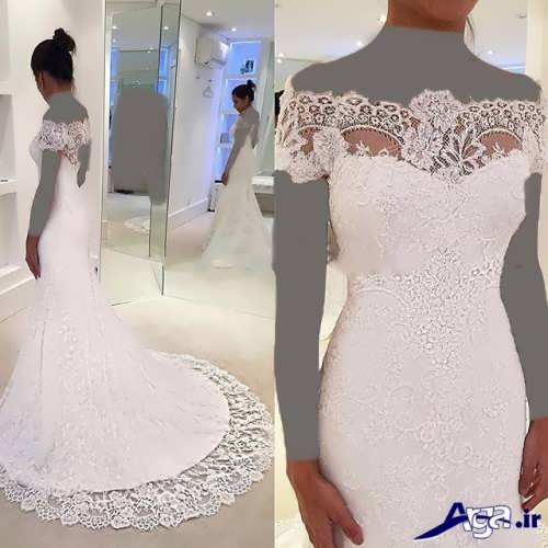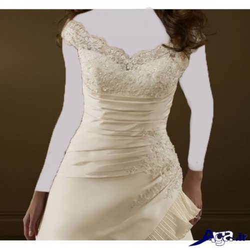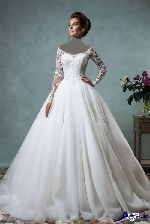 مدل پیراهن عروس های یقه قایقی آستین داریقه این مدل پیراهن عروس ها به شکل قایقی است که دو شانه را به هم وصل کرده است در برخی از این مدل پیراهن عروس ها قسمت جلو و پشت پیراهن عروس توسط بند نازکی که روی شانه ها است به یکدیگر وصل شده اند.مدل پیراهن عروس یقه قایقی، برای افرادی که می خواهند قسمت سینه آن ها پوشیده باشد می تواند انتخاب ایده آل و مناسبی باشد.