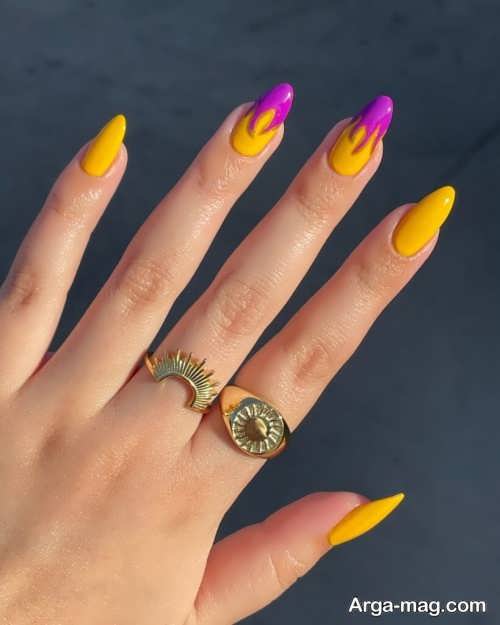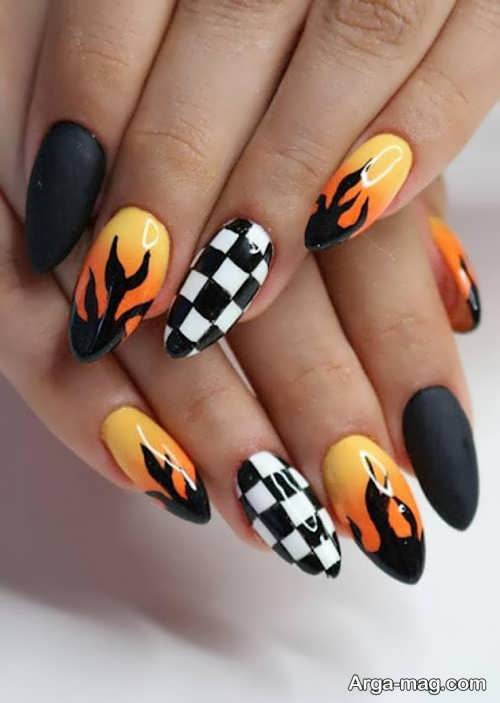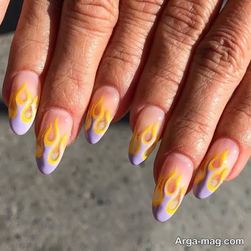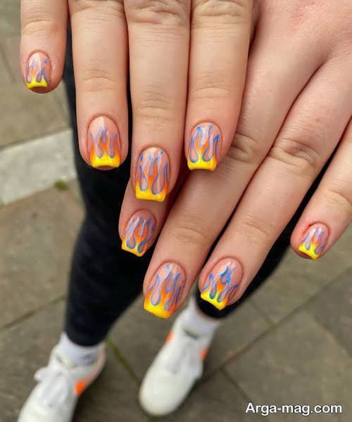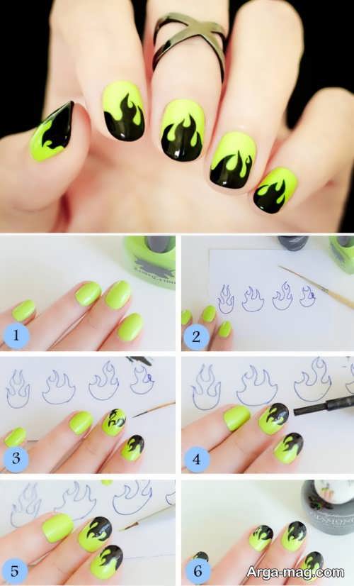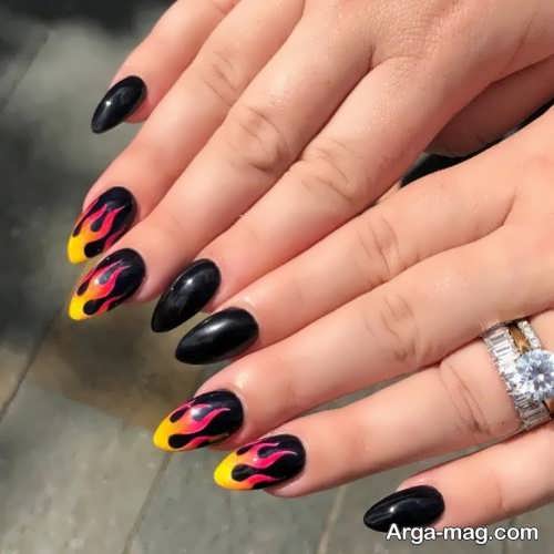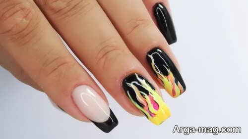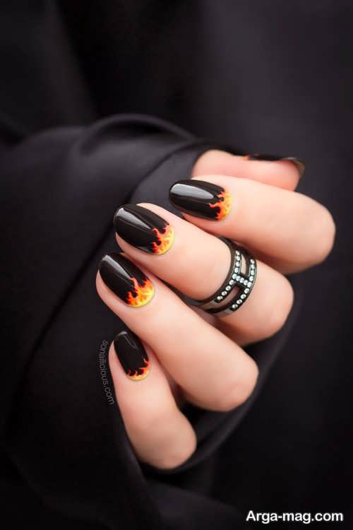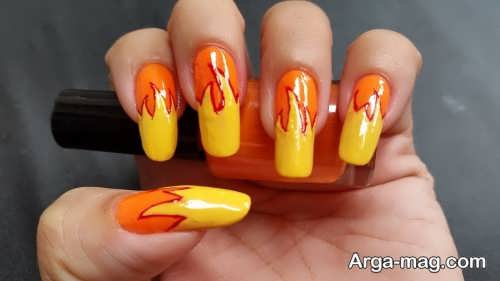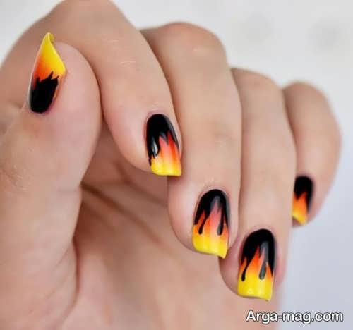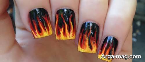 توجه داشته باشید که برای دیزاین ناخن هایتان به کمک این مدل بهتر است ابتدا روی سطح ناخن هایتان را لاک تک رنگ بزنید و اجازه دهید تا لاک به خوبی خشک شود سپس از رنگ مشکی لاک یا رنگ های نارنجی و زرد و … برای ایجاد طرح آتش روی ناخن هایتان استفاده کنید. طرح آتش روی ناخن هایتان را می توانید به کمک قلم مویی نازک ایجاد نمایید همچنین برای دیزاین طرح آتش روی ناخن می توانید از رنگ های روشن و زنده نیز استفاده کنید.