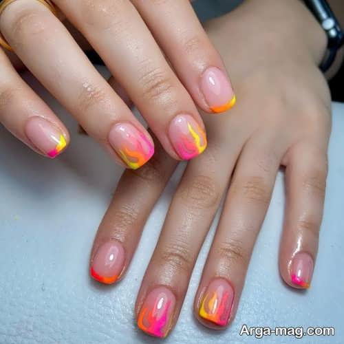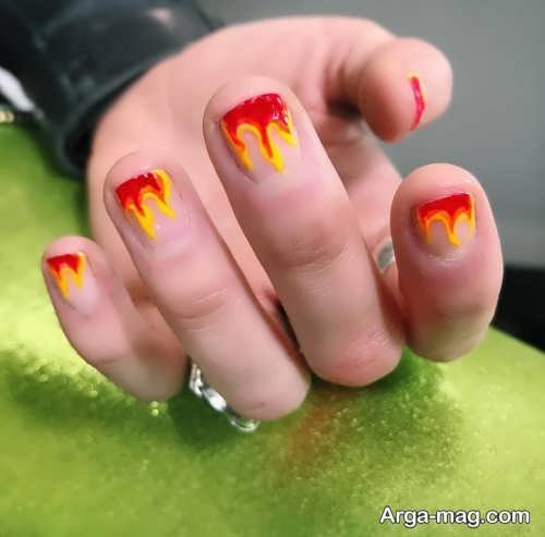 از مدل طرح آتشی می توانید برای دیزاین ناخن های کوتاه نیز استفاده کنید که در این صورت بهتر است طرح آتش را تا نیمه وسطی ناخن ها ایجاد نمایید همچنین می توانید طرح آتش را روی برخی از ناخن ها پیاده سازی نمایید و سایر ناخن هایتان را به صورت ساده دیزاین کنید.