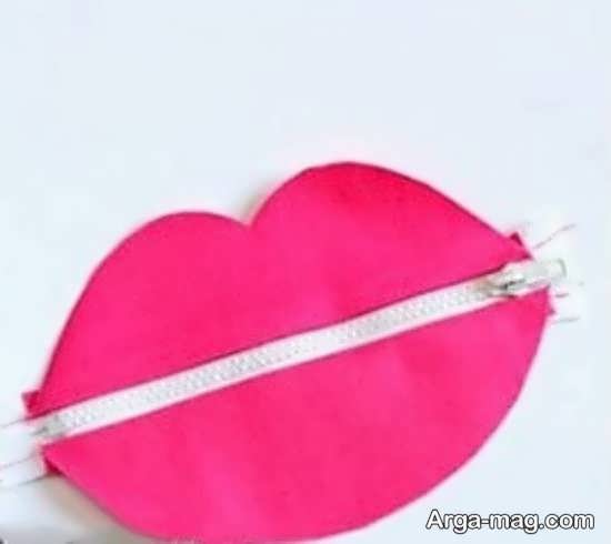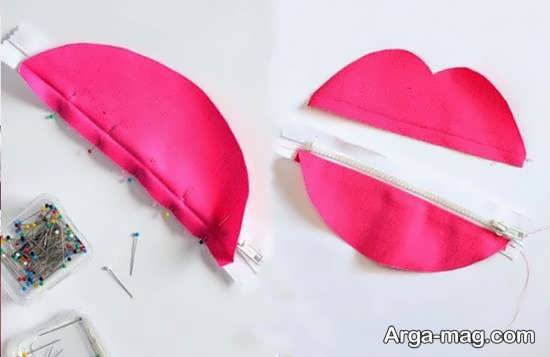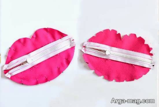 حالا نوبت به دوختن زیپ می رسد. زیپ باید به کناره صاف کیف (لب) دوخته شود. اول یک طرف لب را بر روی زیپ گذاشته و با سوزن ته گرد ثابت کنید. و با در نظر گرفتن جای دوخت بدوزید. (می توانید از عکس کمک بگیرید)