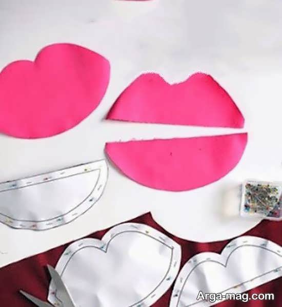 سپس نوبت به برش پارچه می رسد. الگوهای رسم شده را بر روی پارچه نمدی قرار داده و با سوزن ته گرد آن را ثابت کنید. دورتادور الگو خط بکشید و سپس برش بزنید.