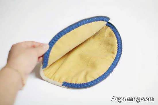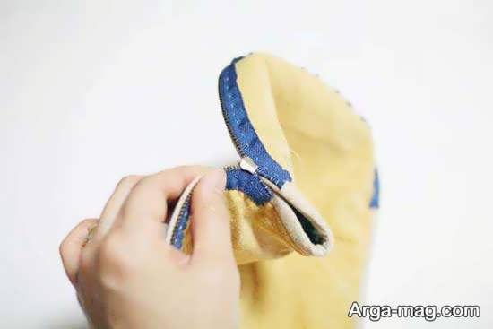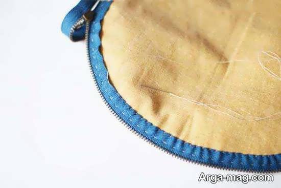 ۱ سمت زیپ را به آستر کیف دوخته و با کمک دست زیپ را به آستر پس دوزی نمایید.