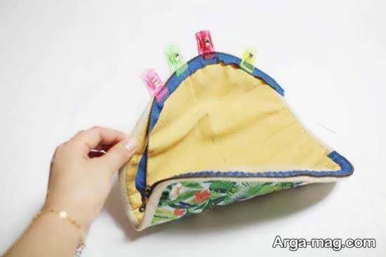 ۲ قطعه جلو و پشت پارچه آستری را نیز بر روی یکدیگر گذاشته و درون کیف جای دهید. کناره های صاف پارچه آستری را به کناره زیپ پس دوز بزنید. دقت داشته باشید که درز دوخته شده برای دیده نشدن، به طرف داخل برود.