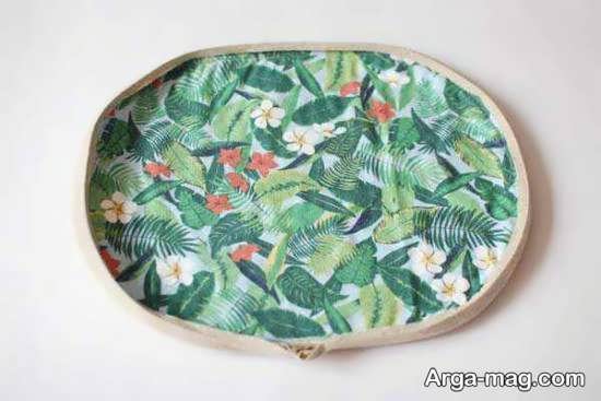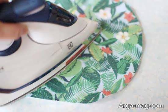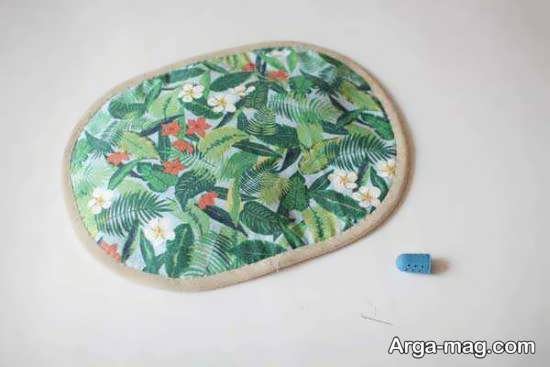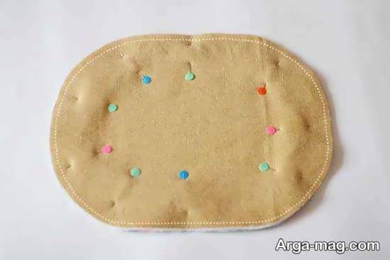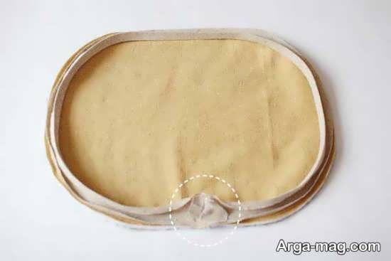 سپس بر اساس الگوی رسم شده، دو قطعه به شکل بیضی (یکی از پارچه آستری، و یکی هم از پارچه رویه) ببرید.