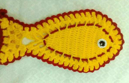 برای برجسته شدن حاشیه دور ماهی 3 زنجیره بافته در اولین زنجیره پایه بلند ببافید. سپس با پایه بلند دولایه را به هم متصل کنید. برای زیباتر شدن لیف ماهی می توانید نوار زنجیره ای را ببافید و از بین زنجیره های آن عبور بدهید. با رنگ سفید و مشکی دایره ای کوچک برای چشم آن ببافید. می توانید رنگ کاموایی که دو لایه لیف را به هم متصل می کنید و نوار زنجیره ای آن را یک رنگ و رنگی متضاد با رنگ لیف انتخاب کنید. این ها کاملا سلیقه ای است.