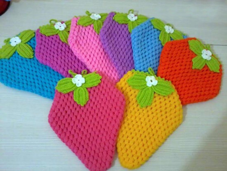 لیف توت فرنگی فقط از دو پهلو اضافه می شود. به عبارتی در دو طرف، دوگره پفکی مابین گره های رج قبل بافته می شود.