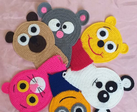 حالا به ترتیب در فاصله هر گره پفکی (یک پایه کوتاه 5 زنجیره و یک پایه کوتاه) ببافید. رج که به پایان رسید داخل حلقه را با پایه کوتاه پر کنید. نخ را محکم کرده و بچینید.