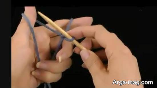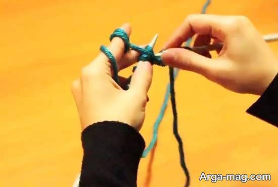 کاموای مورد نظر را گره زده و بر روی میل بیندازید؛ سپس نخ رو به دور شست خود پیچانده و به وسیله ی میل آن را بردارید.