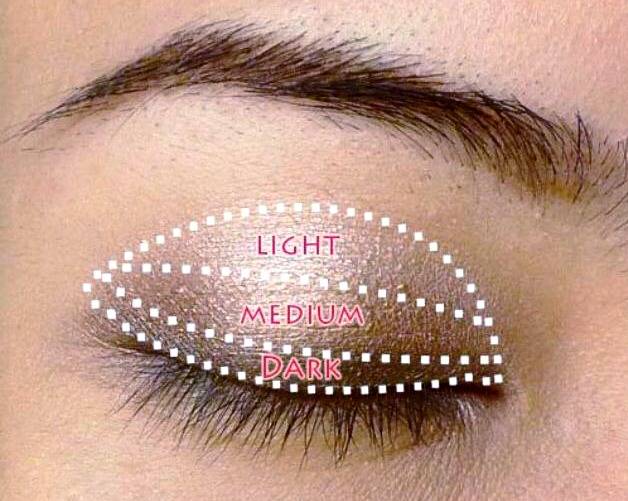 به تصویر نگاه کنید ، در این عکس با چند خط پشت پلک جداسازی شده اند که این جداسازی الگوی زدن رنگ سایه های روشن و تیره برای چشم های پف دار است. همانطور که متوجه شدید نزدیک ترین قسمت به مژه ها را با سایه تیره و دورترین قسمت را با سایه روشن آرایش می کنیم.