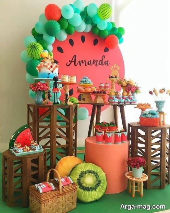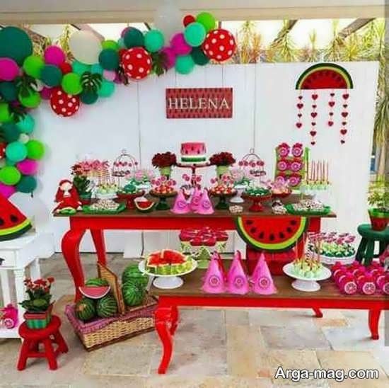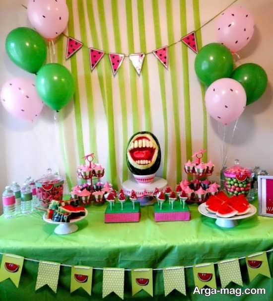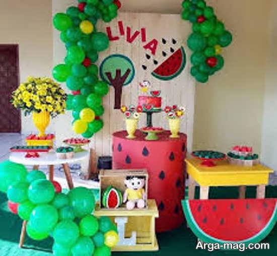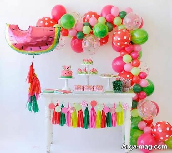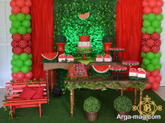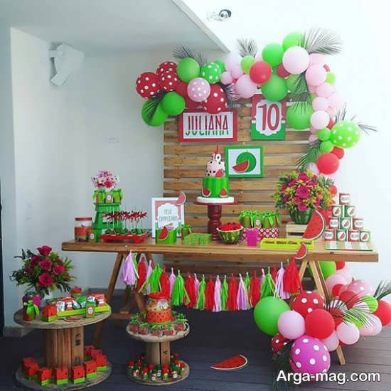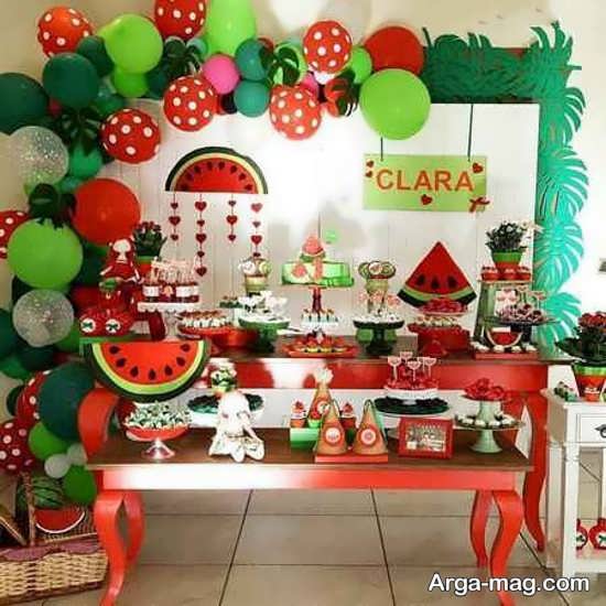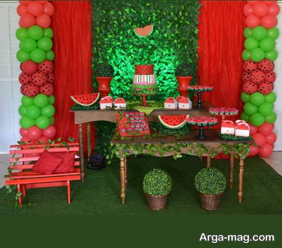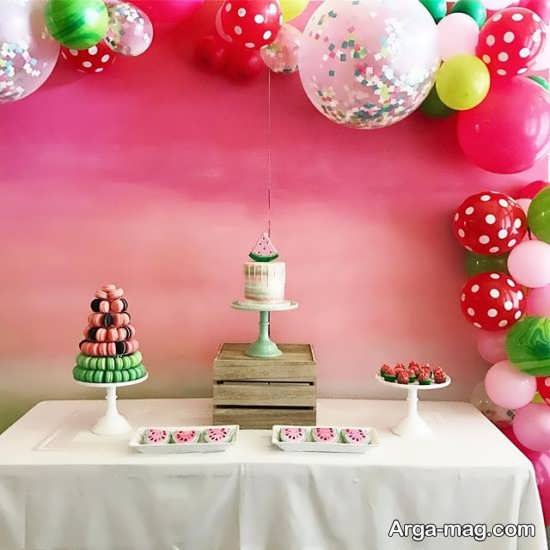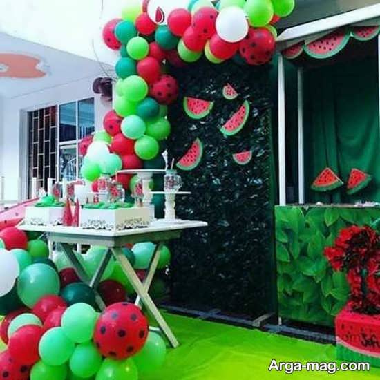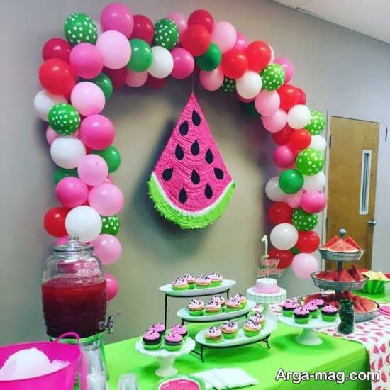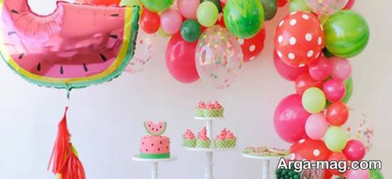 از آنجا که بسیاری از افراد ممکن است تاریخ تولدشان مصادف با این شب خاطر انگیز باشد، از این رو استفاده از بادکنک آرایی یا تزیینات دیگر از جمله تزیین تنقلات شب یلدا، تزیینات کیک شب یلدا، تزیینات میوه، دسر، ژله و … با تم هندوانه ای برای دیزاین جشن تولد یلدایی و بسیاری از مهمانی های مخصوص این شب ایده بسیار جذابی است که در ادامه با نمونه هایی دیدنی از این نوع تزیینات شکیل و جذاب می توانید آشنا شوید.